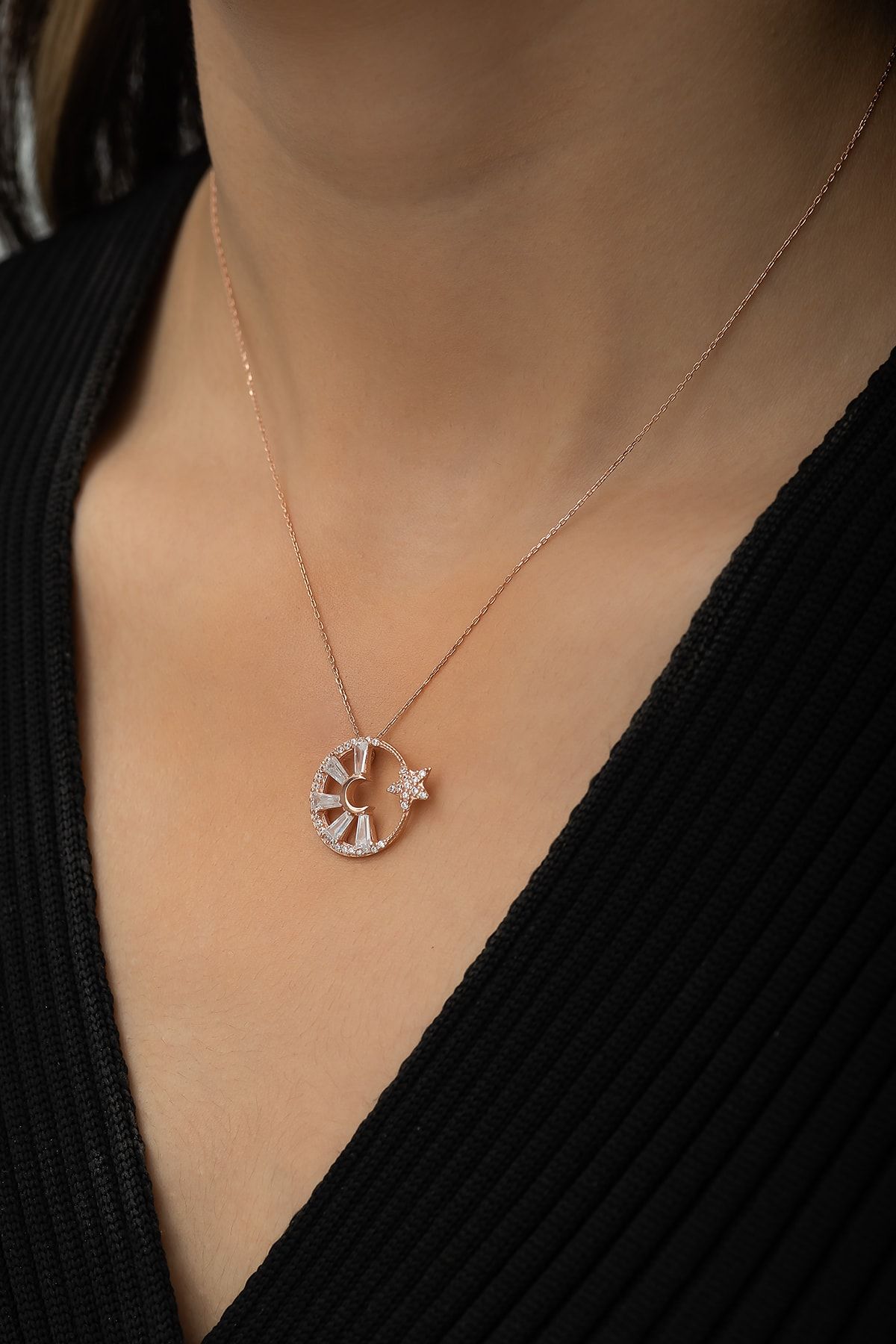 Baget Taşlı Ayyıldız Bayrak Kolye Rose Gold Kaplama 925 Ayar Gümüş UVPS100488Maden : 925 Ayar GümüşDeğerli Taş : Nano ZirkonKaplama: Rose Altın.Renk : Rose Altın.Zincir uzunluğu : 43 cm (+-) + Uzatma ek zincirÜrün ağırlığı : 4.00 Gr (+-).Teslimat: Papatya Silver tarafından Ürün ahşap hediye kutusunda gönderilecektir.