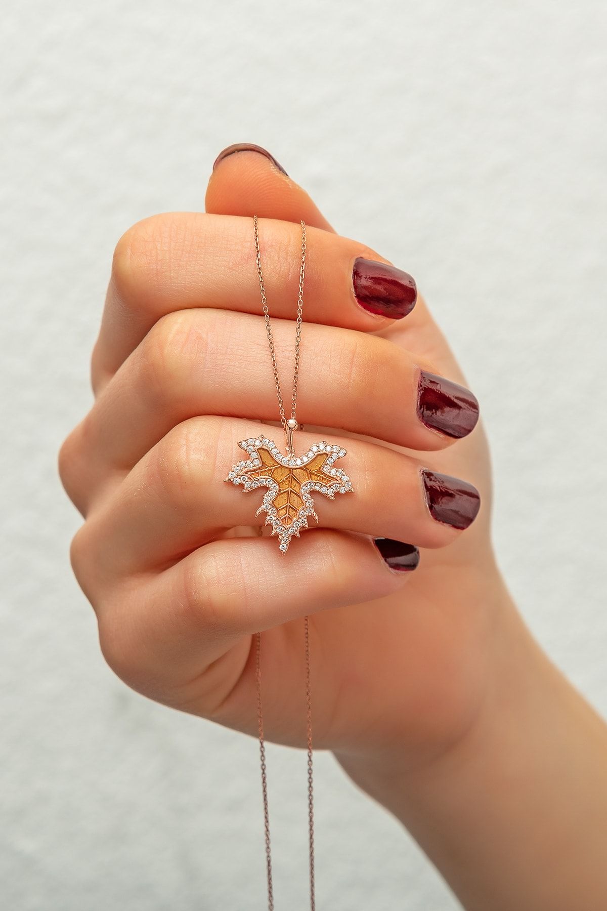 Çınar Yaprağı Sonbahar Kolye Rose Altın Kaplama 925 Ayar Gümüş - UVPS400538Maden : 925 Ayar gümüş.Taş : Nano zirkonKaplama : Rose altın kaplama - MineZincir uzunluğu : 43 cm.Ürün ağırlığı : 4 Gr (+-).Teslimat : Ürün hediye kutusunda gönderilecektir.