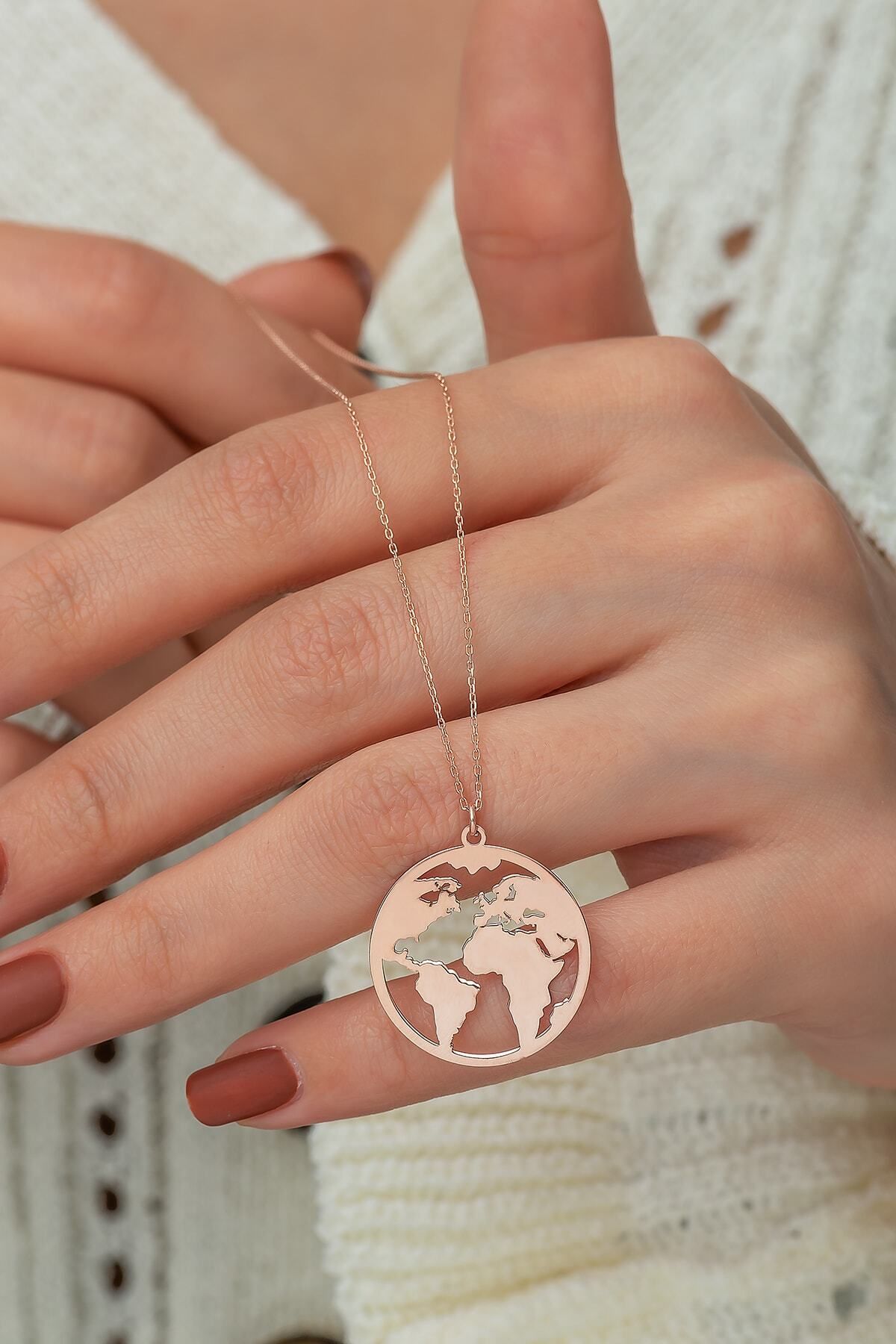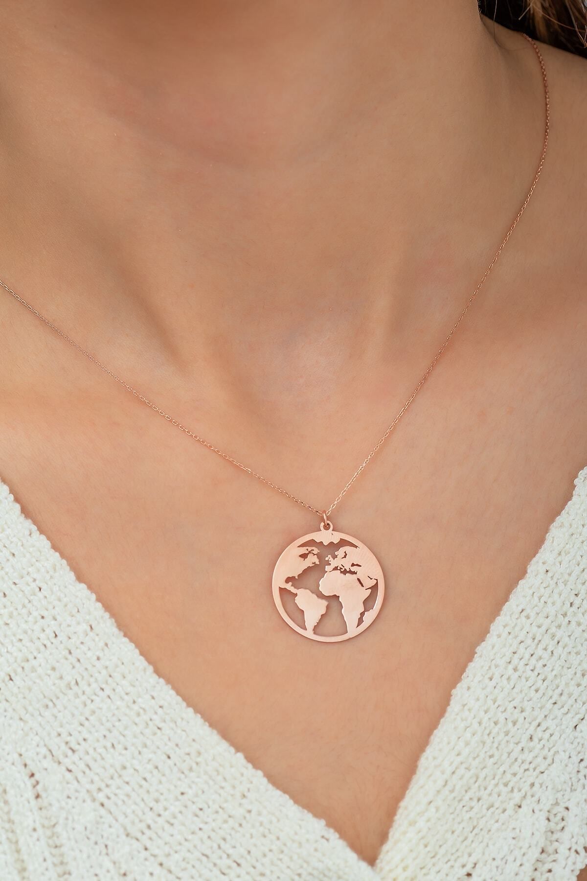 Dünya Haritası Kolye Rose Altın Kaplama 925 Ayar Gümüş