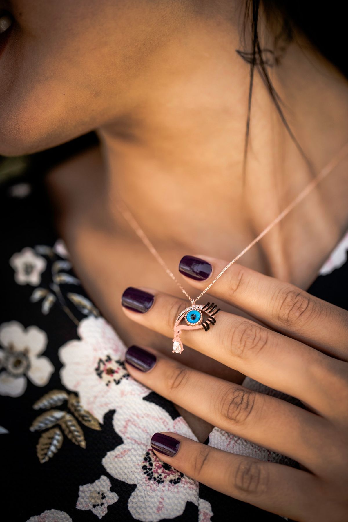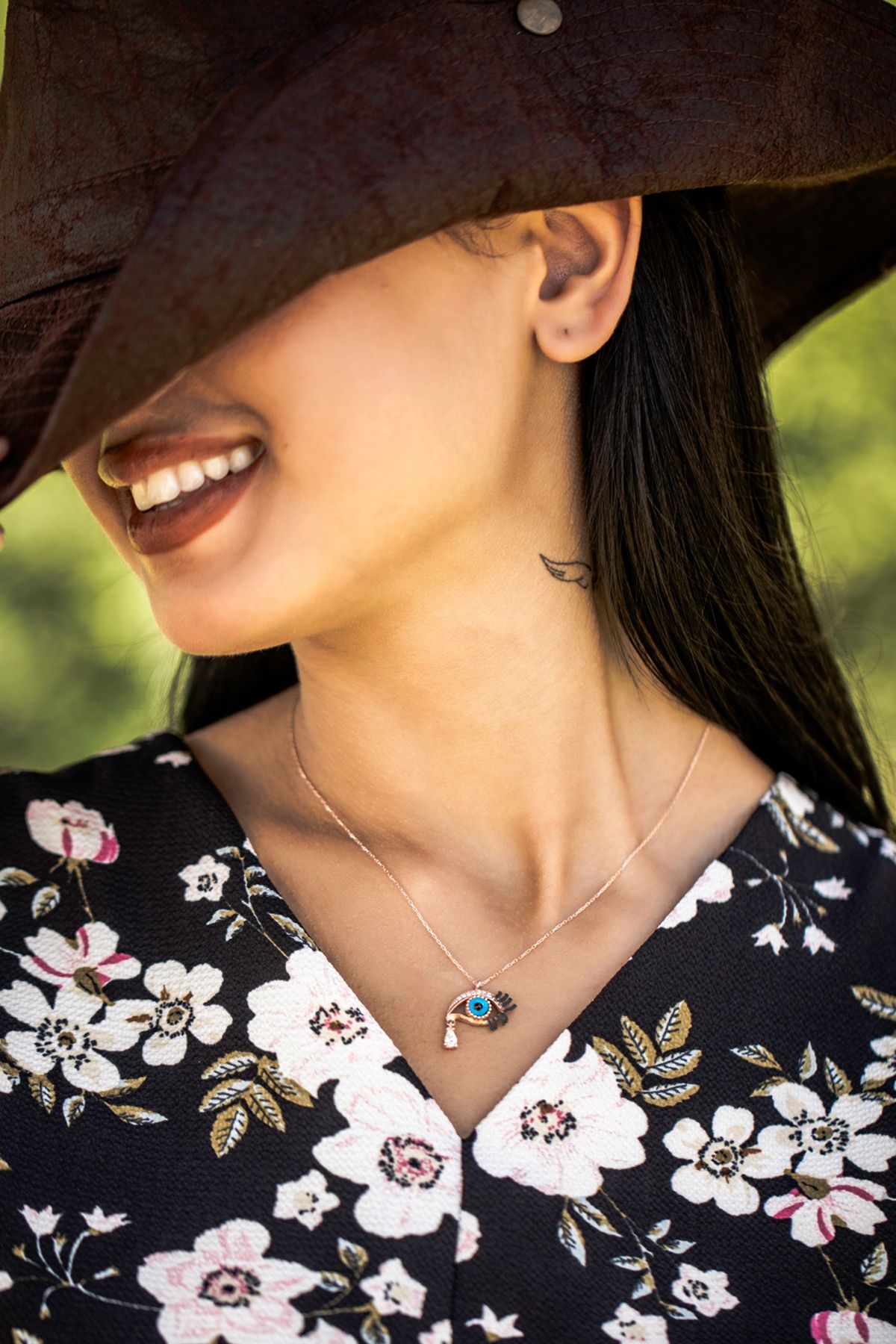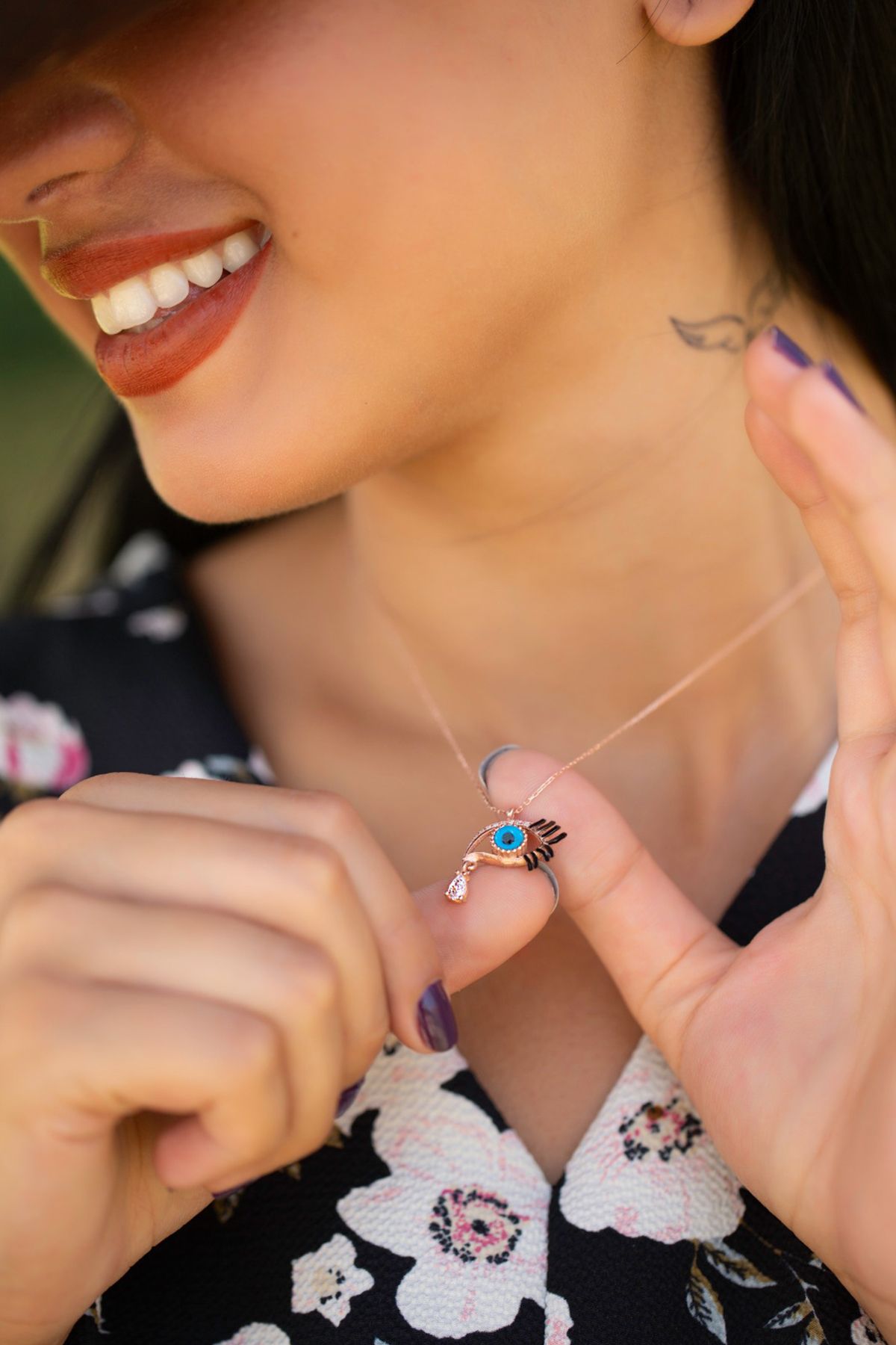 Göz Damlası Nazar Göz Bebekli 925 Ayar Gümüş Rose Altın Kaplama Kadın Kolyesi Maden: 925 Ayar gümüş. Taş: Nano Zirkon taşlı - Mineli Nazar Gözlü Kaplama : Rose Altın kaplama.En*Boy:1,5*1 cm. Damla En*Boy:3*5 mm. Zincir uzunluğu: 43 cm. Ürün ağırlığı : 3 Gr (+-). Teslimat: Papatya Silver tarafından Ürün ahşap hediye kutusunda gönderilecektir.