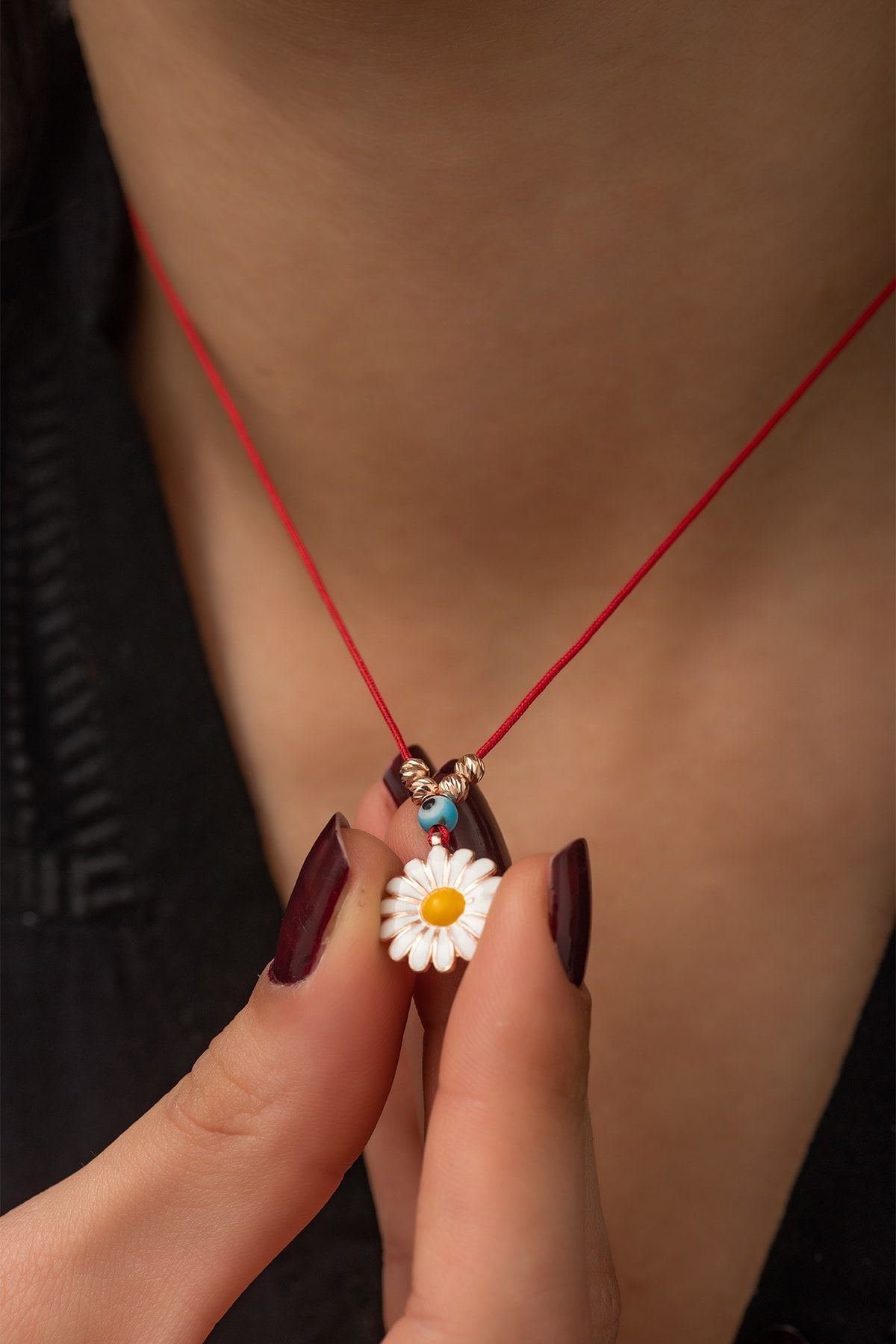 Kırmızı İpli Mineli Paptya Kolye - Nazarlı ve Dorica Toplu Rose Gold Kaplama 925 Ayar Gümüş Küçük Boy Kolye - UVPS100245