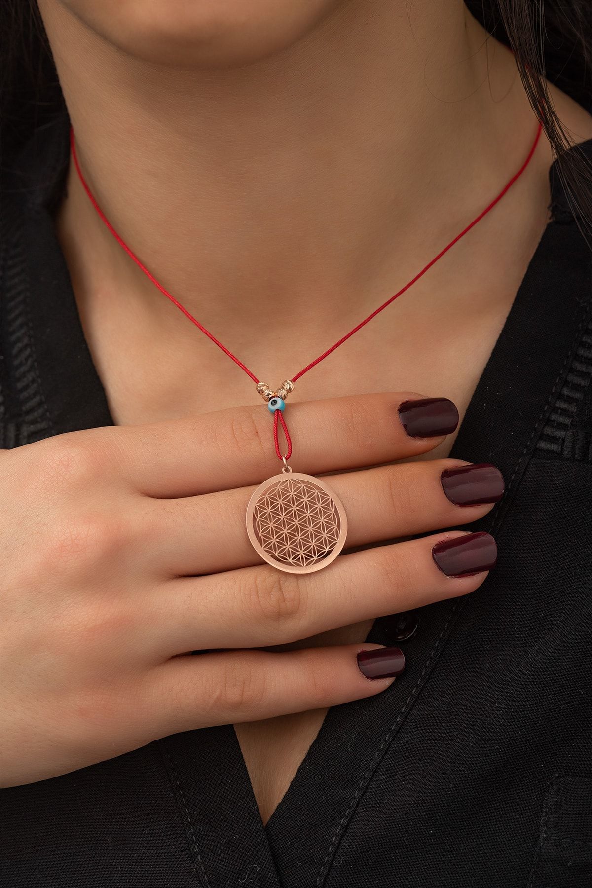 Kırmızı İpli Yaşam Çiçeği Kolye - Nazarlı ve Dorica Toplu Rose Gold Kaplama 925 Ayar Gümüş Kolye - UVPS100242