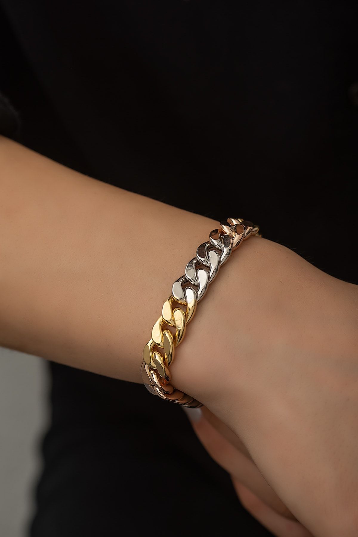 Halloy Bileklik Büyük Boy - Üç renk kaplama gourmet zincir modeli 925 ayar gümüş - UVPS200029Maden: 925 Ayar gümüş.Kaplama : 14 Ayar Altın - Rose Altın - Rodyum KaplamaRenk : Altın - Gümüş.Zincir uzunluğu: 18 cm.Ürün ağırlığı : 13.00 Gr (+-).Teslimat: Papatya Silver tarafından ürün kutusunda gönderilecektir. 15 gün iade garantisi.