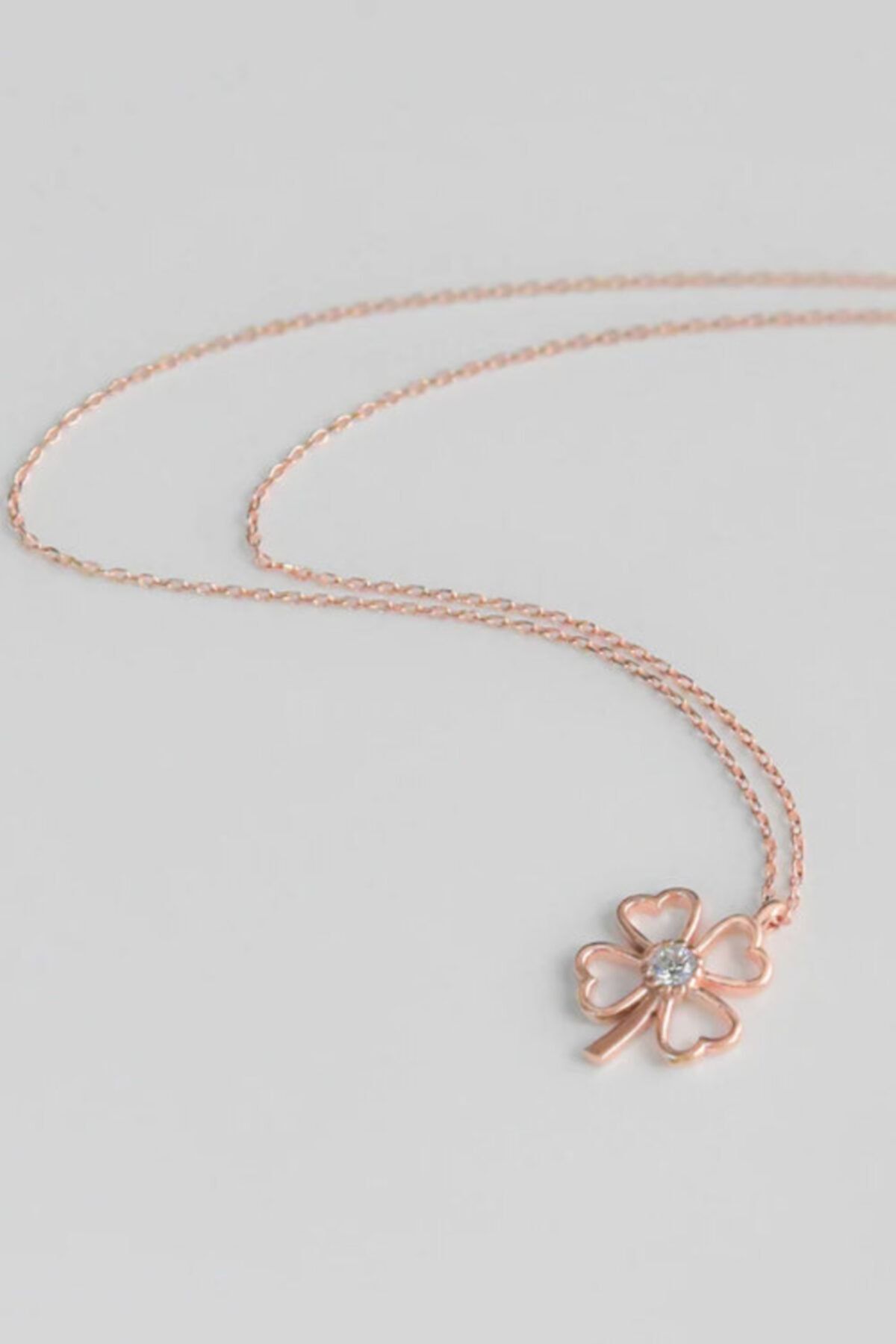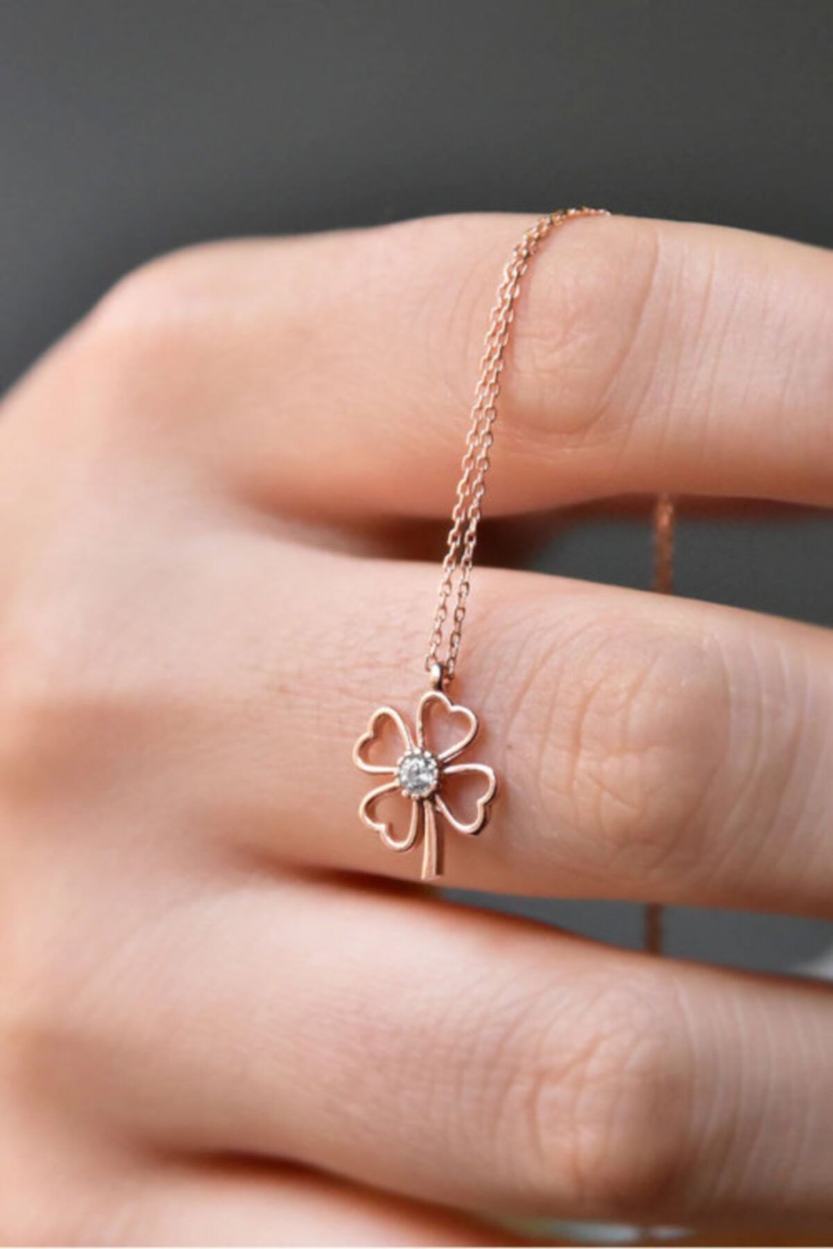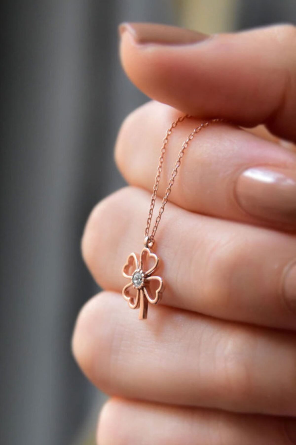 Kadın Tektaşlı Yonca Model Rose Kaplama 925 Ayar Gümüş Kolye. Maden : 925 Ayar Gümüş.Renk : Rose Altın. Taş: Zirkon. Zincir Uzunluğu: 42 cm. Teslimat: Papatya Silver tarafından Ürün ahşap hediye kutusunda gönderilecektir. Ürün Ağırlığı : 1,50gr +-). Gümüş ve değerli taşlar nedeniyle belirtilen ortalama ürün ağırlığında ± %10 sapma olabilmektedir.