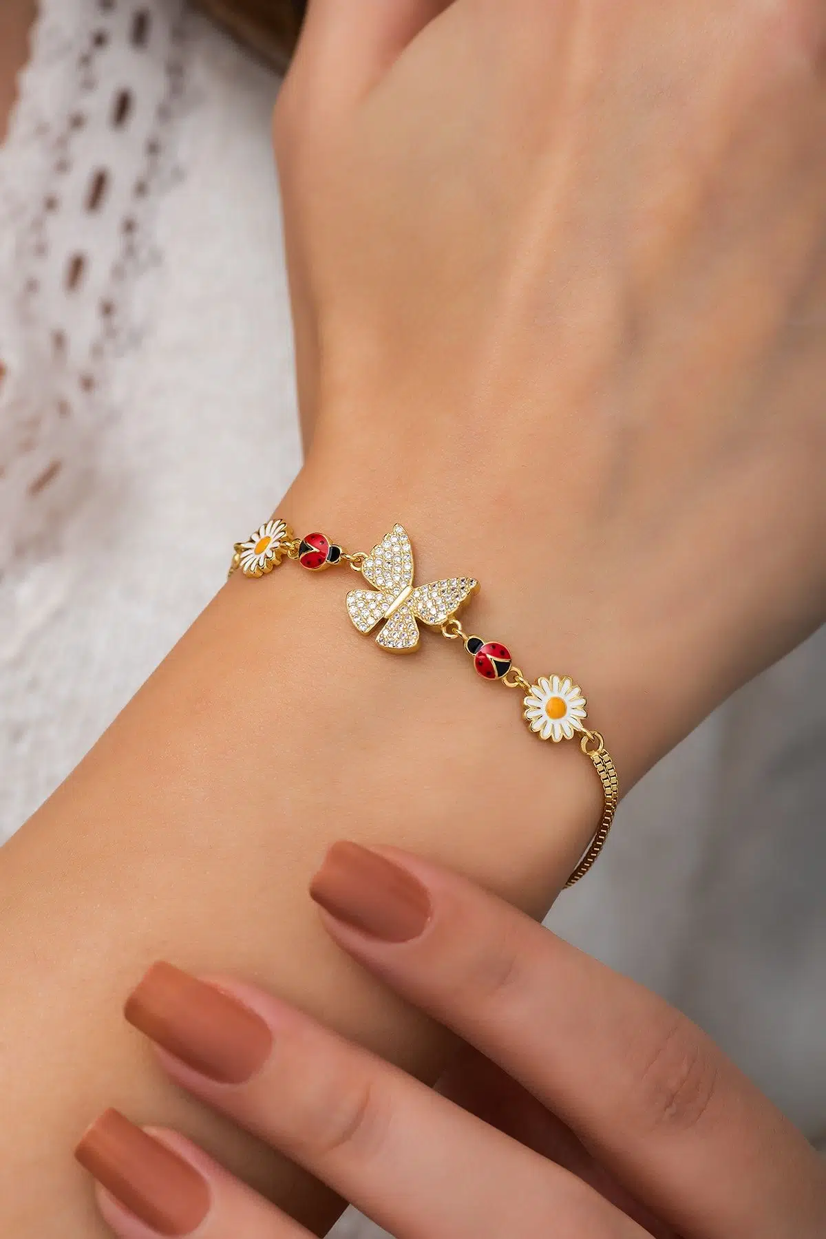 Kelebek Bileklik. Papatya Bileklik. Uğur Böceği Bileklik. Renkli Mineli 14 Ayar Altın Kaplama 925 Ayar Gümüş Bileklik - UVPS200157Maden : 925 Ayar gümüş.Değerli Taş : Nano Zirkon.Kaplama : 14 Ayar Altın Kaplama - Mine.Renk : Altın.Zincir uzunluğu : 18 cm + ( 3 cm uzatma zinciri )Ürün ağırlığı :6 - 7 Gr (+-).