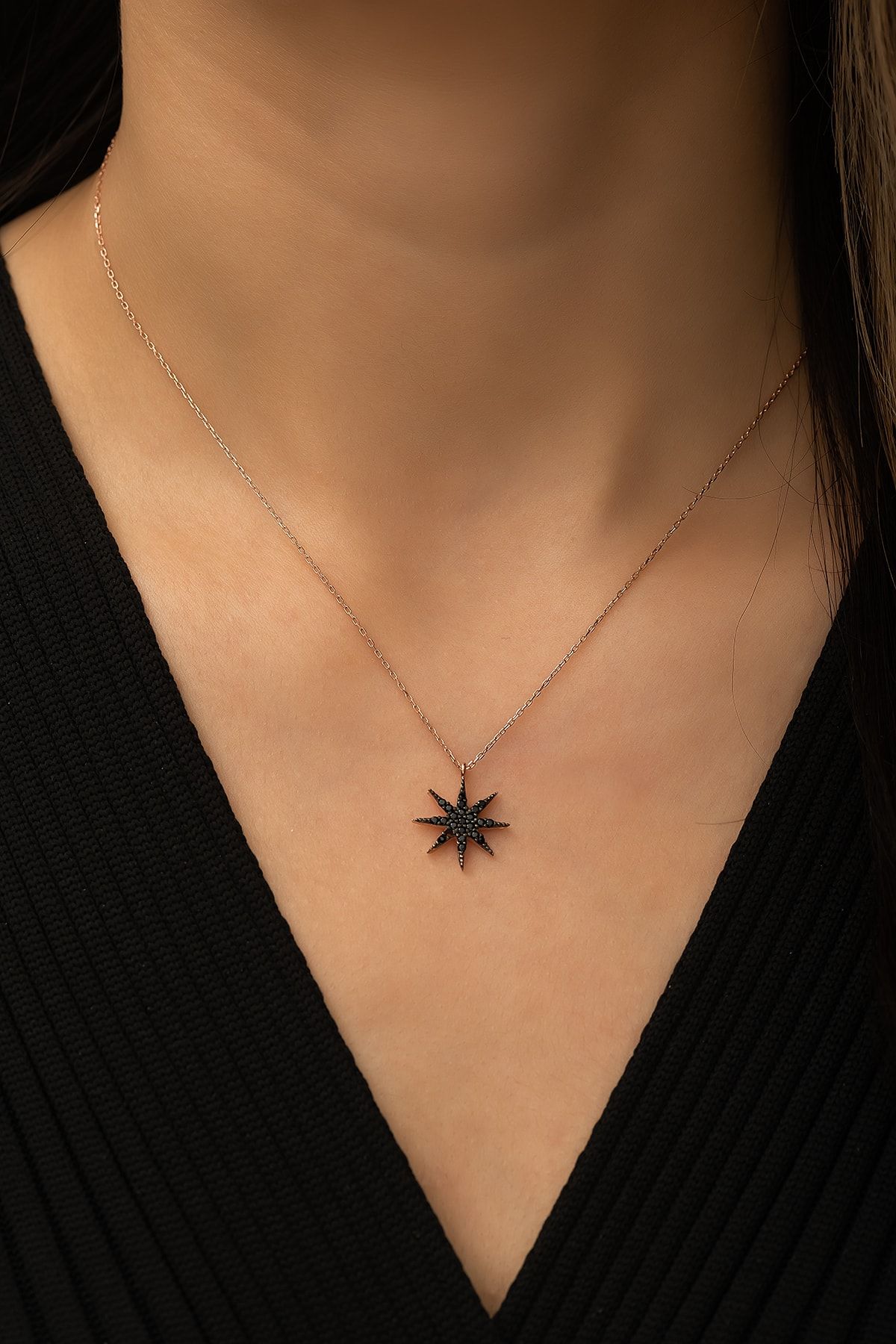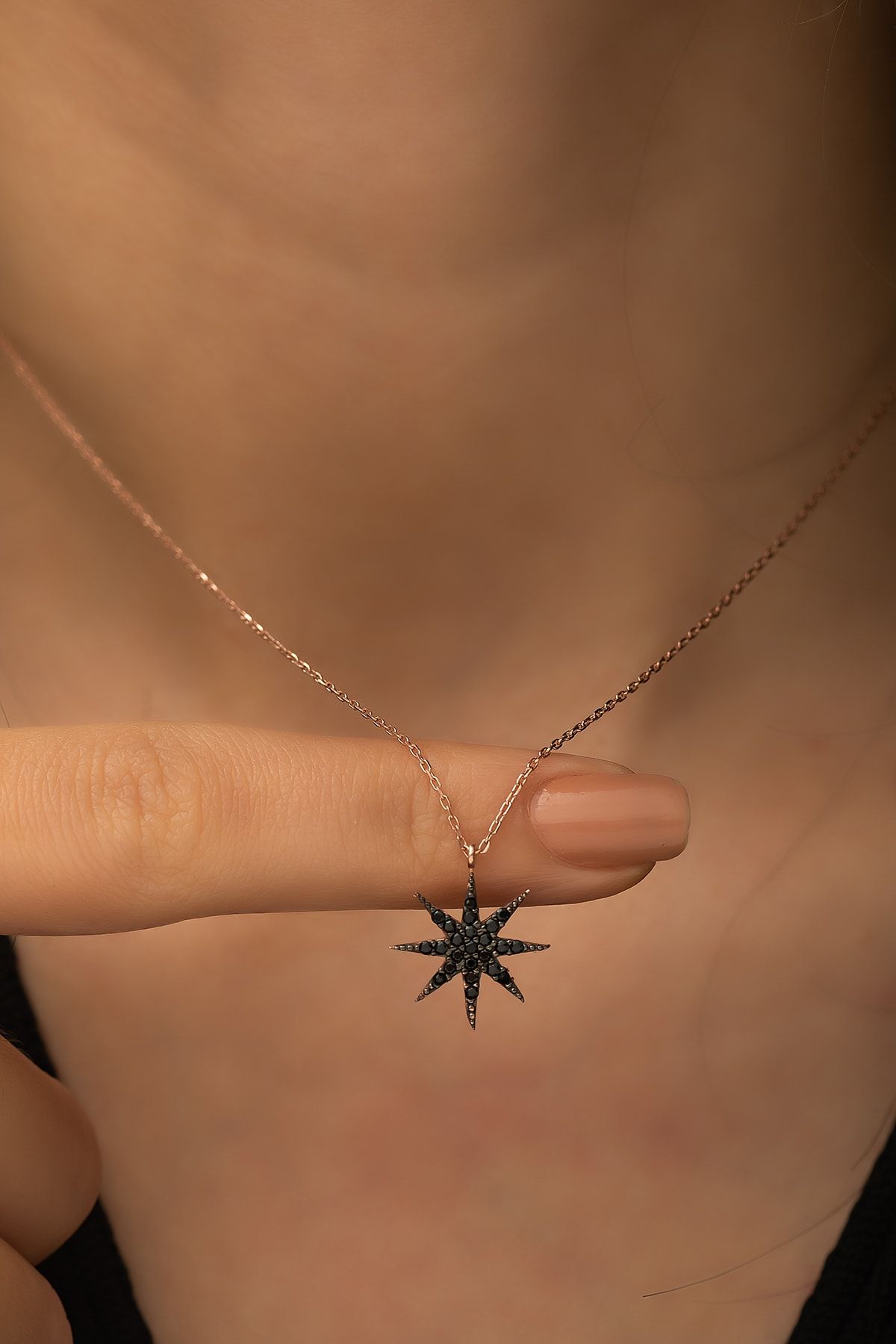 Kutup Yıdızı Siyah Nano Zirkon Taşlı Kolye Rose Altın Kaplama 925 ayar Gümüş - UVPS100441Maden : 925 Ayar Gümüş.Kaplama : Rose AltınDeğerli Taş : Nano Zirkon.Renk : Rose AltınZincir uzunluğu : 43 cm.Ürün ağırlığı : 3,00. Gr (+-).Teslimat: Papatya Silver tarafından Ürün ahşap hediye kutusunda gönderilecektir.