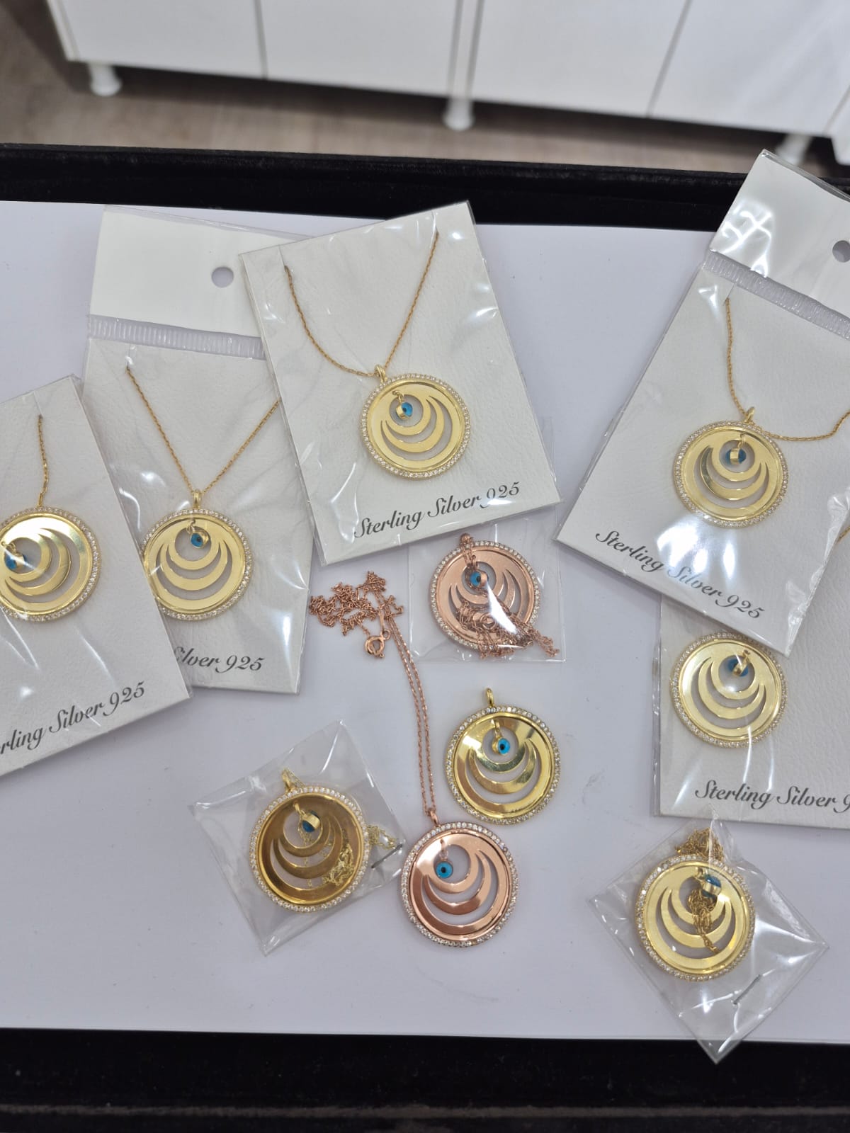 Nazar göz sallantılı, rose altın kaplama nano zirkon taşlı aile kolyesi. Maden : 925 Ayar gümüş. Kaplama : Rose Altın kaplama. Renk : Altın. Taş : Nano Zirkon taşlı. Zincir uzunluğu : 45 cm. Ürün ağırlığı : 5.50 Gr (+-). Teslimat: Ürün ahşap hediye kutusunda gönderilecektir.