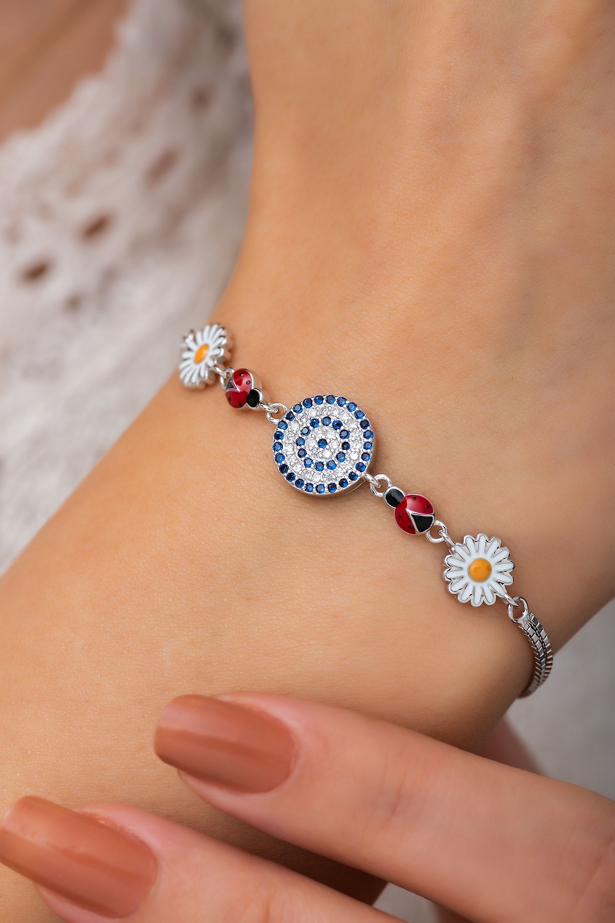 Nazargöz Papatya Uğur Böceği Renkli Mineli Rodyum Kaplama 925 Ayar Gümüş Bileklik - UVPS200159Maden : 925 Ayar gümüş.Değerli Taş : Nano Zirkon.Kaplama : Rodyum Kaplama - Mine.Renk : Gümüş.Zincir uzunluğu : 18 cm + ( 3 cm uzatma zinciri )Ürün ağırlığı :6 - 7 Gr (+-).