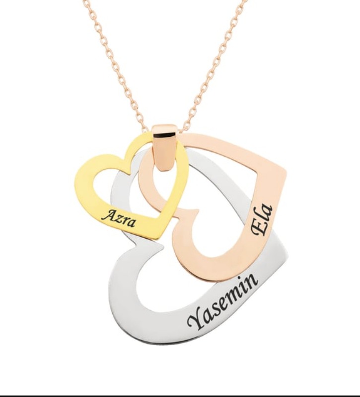 925 ayar gümüş kişiselleştirmesi bulunan kolye. Aile kolyesi. 3 kalp 3 renk kişiye özel isim kolye. manolya kolye. gül kolye. rose kolye.