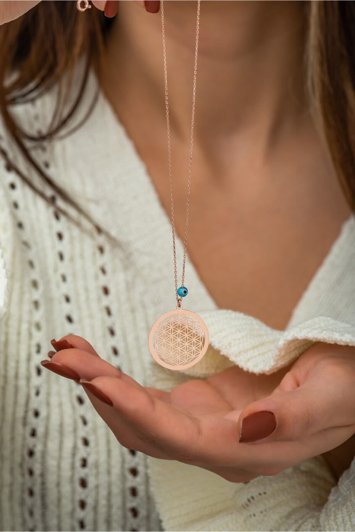 Yaşam Çiçeği Nazar Gözlü Rose Altın Kaplama 925 Ayar Gümüş Kolye -Maden : 925 Ayar gümüş. Taş : Mineli Nazar Gözlü Kaplama : Rose Altın kaplama. Zincir uzunluğu : 43 cm. Ürün ağırlığı : 2,0 Gr (+-). Gümüş ve değerli taşlar nedeniyle belirtilen ortalama ürün ağırlığında ± %10 sapma olabilmektedir Teslimat : Ürün hediye kutusunda gönderilecektir.
