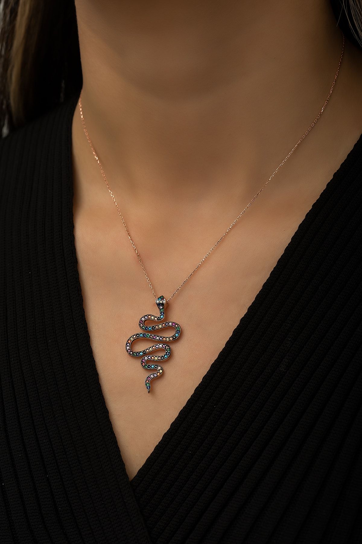 EtiketlerYılan Kolye Renkli Mix Nano Zirkon Taşlı Rose Gold Kaplama 925 Ayar Gümüş Kolye - Uvps100410