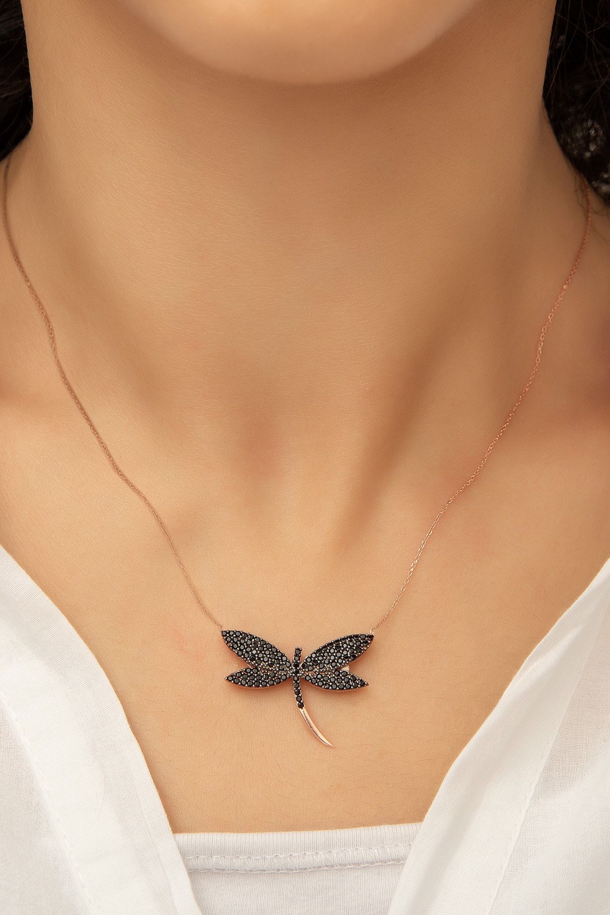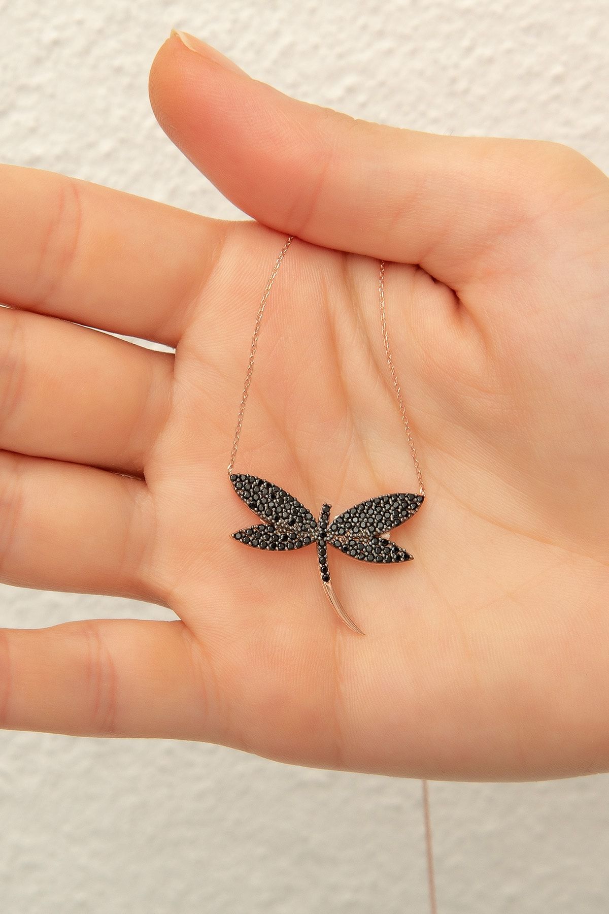 Yusufçuk Kolye. Rose Altın Kaplama Siyah Nano Zirkon Taşlı 925 Ayar Gümüş. Maden : 925 Ayar gümüş. Kaplama : Rose altın kaplama. Renk : Rose altın. Taş : Nano Zirkon Siyah Zincir uzunluğu : 45 cm. Ürün ağırlığı : 3.70 Gr (+-). Teslimat: Ürün ahşap hediye kutusunda gönderilecektir.